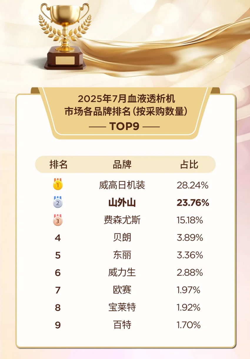 在血液凈化設(shè)備領(lǐng)域,山外山正以強(qiáng)勁勢(shì)頭彰顯行業(yè)引領(lǐng)力。據(jù)權(quán)威平臺(tái)“今日標(biāo)訊”2025年7月招標(biāo)數(shù)據(jù)顯示,其自主研發(fā)的SWS系列血液透析機(jī)以23.76%的市場(chǎng)份額穩(wěn)居行業(yè)第二,且在國(guó)產(chǎn)自主品牌中位列第一,單月表現(xiàn)亮眼。